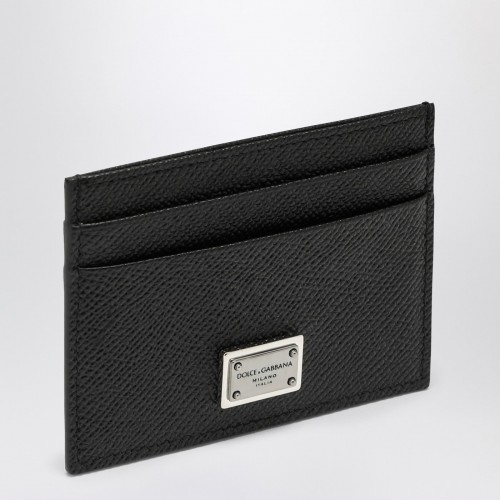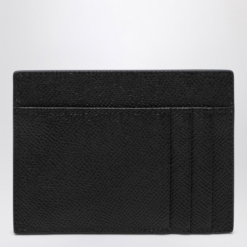 Black grained calfskin card holder by Dolce & Gabbana, featuring six card slots, a logo plaque on the front and a central slit pocket.
