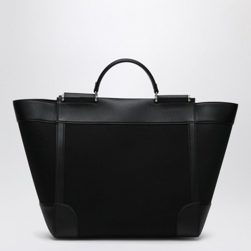 Dolce & Gabbana black fabric and leather tote bag, featuring an adjustable and removable leather shoulder strap, two top handles, front logo print, snap closure, and an internal zip pocket.