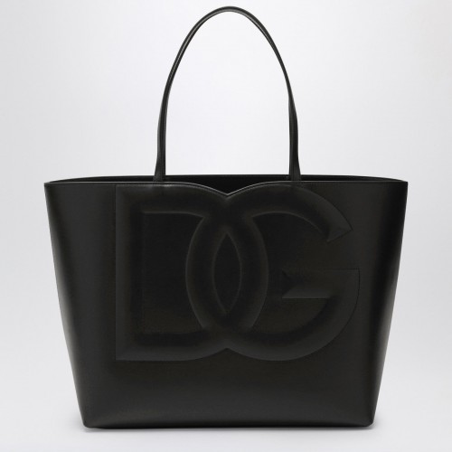 Black leather tote bag from Dolce & Gabbana featuring a logo on the front, two top handles, an internal zipped pocket and a printed lining.