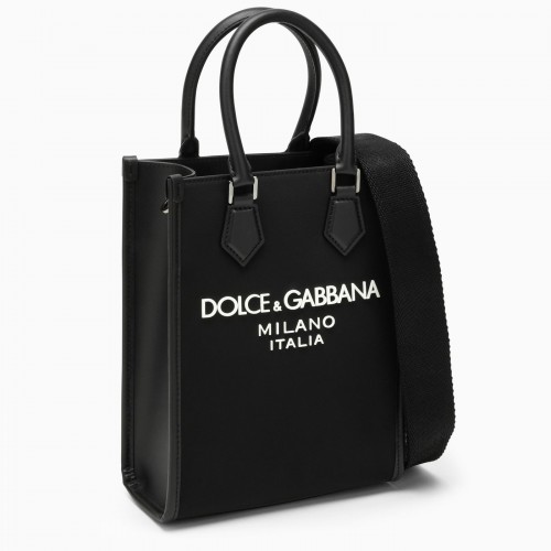 Small black nylon bag from Dolce & Gabbana featuring a rubberised lettering logo on the front in contrasting white, two upper calfskin handles, an internal flat pocket and an adjustable, removable shoulder strap.