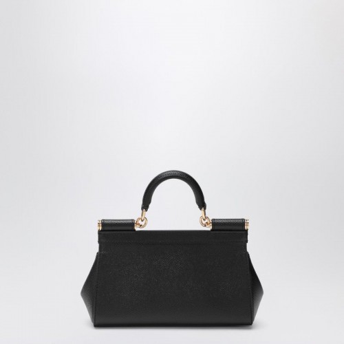 Small handbag by Dolce & Gabbana in black hammered leather, characterized by a front flap with a logo plate, closure with a hidden double magnet, handle, adjustable and removable shoulder strap, printed fabric inner lining, and gold metal hardware.