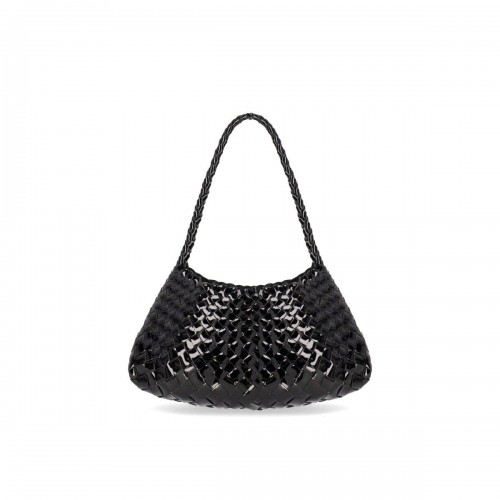 Rosanna bag by Dragon Diffusion made of black patent leather, featuring a woven pattern. Unlined interior, thin handle. Dimensions: 32x17x10 cm.