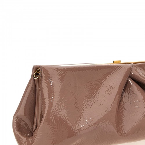 Maxi patent leather clutch with snap closure, adjustable and removable shoulder strap.