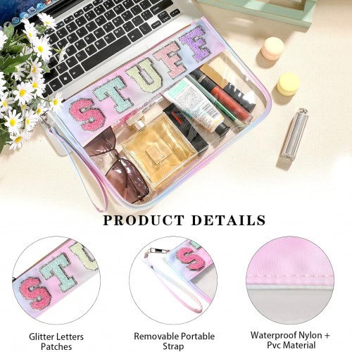 DYSHAYEN Chenille Letter Clear Zipper Pouch for Travel,Nylon Clear Cosmetic Bag,Makeup Travel Bag for Women Girls 11.8 Inches x 8.2 Inches