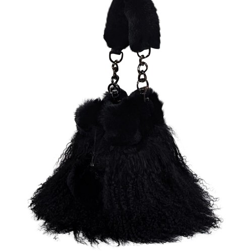 Stay warm and stylish with the Ectcetra black lamb fur mini bucket bag. The soft black lamb fur with rabbit fur trim and detachable chain straps make it perfect for cold weather. Dress it up with a matching fur vest and tall boots for a cute and chic look.