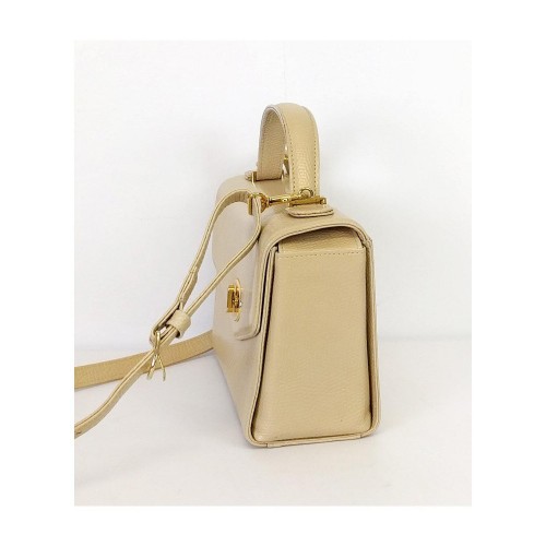 This structured handbag has a textured leather with gold-tone accents. The perfect day bag, it has a detachable crossbody strap for versatility.