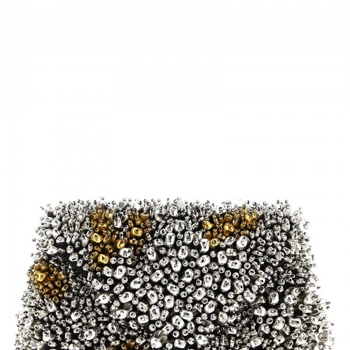 ‘Emilio’ clutch bag in all-over printed silk twill, front enamelled metal logo plate, spiral metal ring closure in which to insert the fixed handle.