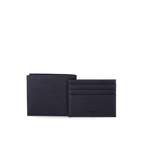 Set by Emporio Armani consisting of a wallet and card holder made from matching blue hammered leather. Decorated with the Emporio Armani logo in tone. Wallet dimensions 9x11x2 cm. Card holder dimensions 10x8x2 cm.