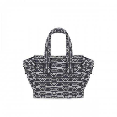 Mini bag by Emporio Armani made of cotton canvas in shades of blue and ecru. Characterized by an all-over jacquard monogram design, it features double handles in matching tones and a zip closure. Adorned on the front of the accessory with an embroidered EA logo. Lined, it has an internal flap pocket and a zip pocket. Enhanced with a coordinated tag and a charm with an engraved eagle logo in gold metal. Adjustable and removable shoulder strap. Dimensions 28.5×15.5×10 cm
