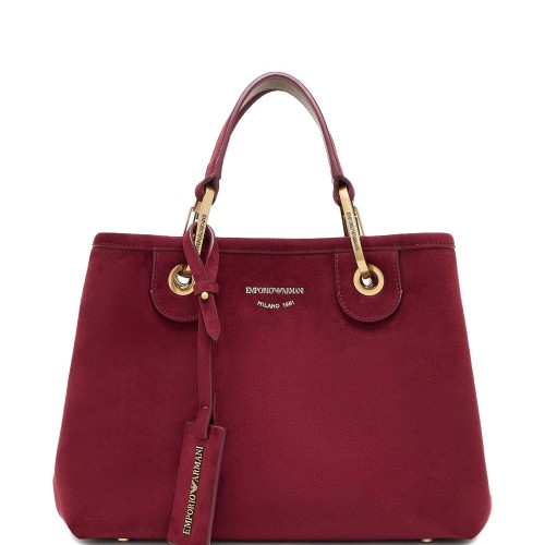 dark red suede texture top handles gold-tone rings internal zip pocket hanging tag