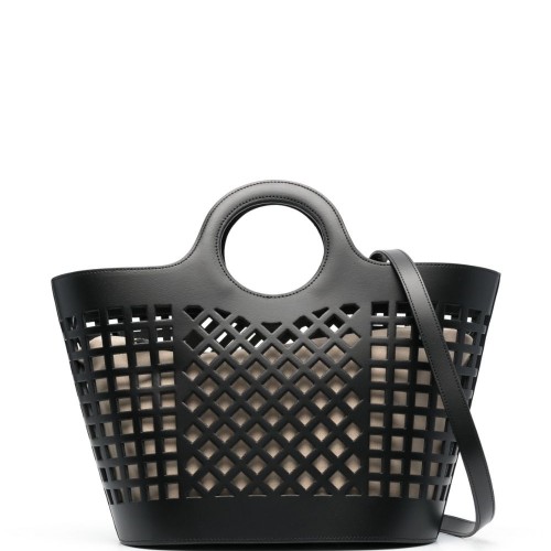 light pink calf leather smooth grain laser-cut detail with logo motif rectangle body two flat top handles detachable logo plaque main compartment internal zipped pouch silver-tone hardware top zip fastening