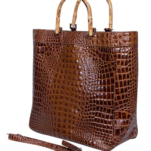 Eric Brand – Brown Croc Embossed Tote w/ Bamboo Handles & Detachable Strap