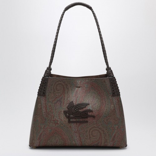 Small ‘Libra’ shopping bag in ‘Arnica’ Paisley jacquard canvas and leather, front leather ‘Pegaso’ logo patch, double braided fixed handle, inner carabiner closure, rigid base with metal feet, removable suede clutch bag.