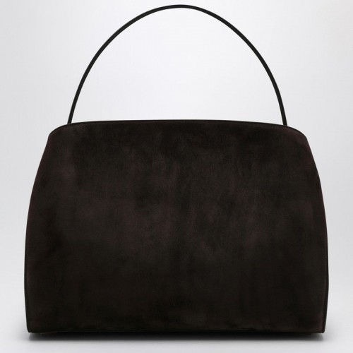 Large shoulder bag by Ferragamo in brown suede, characterized by Gancini buckles in gold finish, internal flap closure with magnetic fastening, a central compartment with zip and embossed logo lettering on the front.