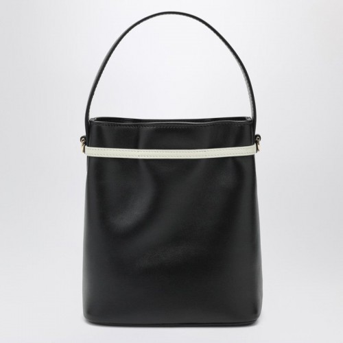 Bucket bag by Ferragamo in black leather, featuring top handle, adjustable and removable shoulder strap, mascarpone-colored bow detail and internal flat pocket.