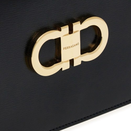 black calfskin Gancini plaque logo-engraved gold-tone hardware adjustable detachable shoulder strap single chain-link top handle foldover top with magnetic fastening internal logo stamp internal slip pocket