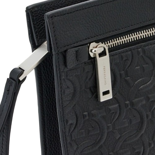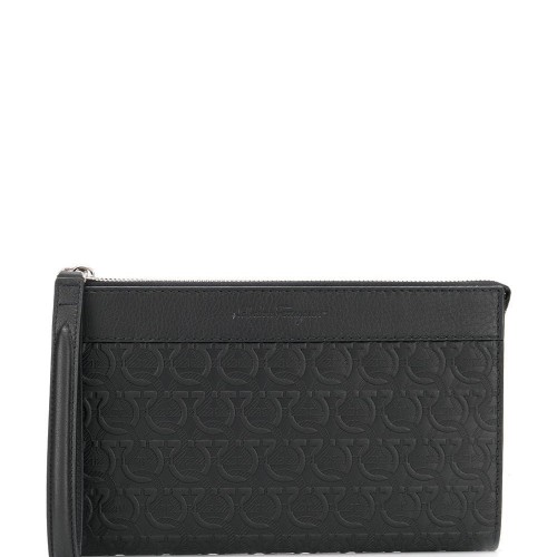 black calf leather grained texture all-over embossed logo print Gancini print logo-engraved silver-tone hardware top zip fastening wrist strap front zip-fastening pocket partitioned compartment