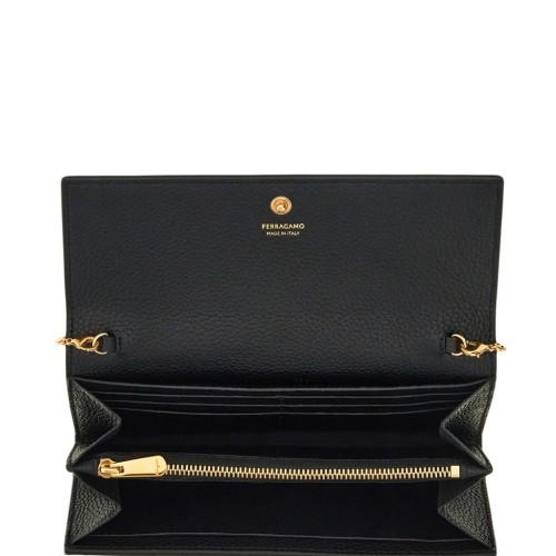 black calf leather pebbled texture Gancini plaque foldover top with press-stud fastening detachable chain-link shoulder strap internal logo stamp partitioned compartment internal zip-fastening pocket internal card slots