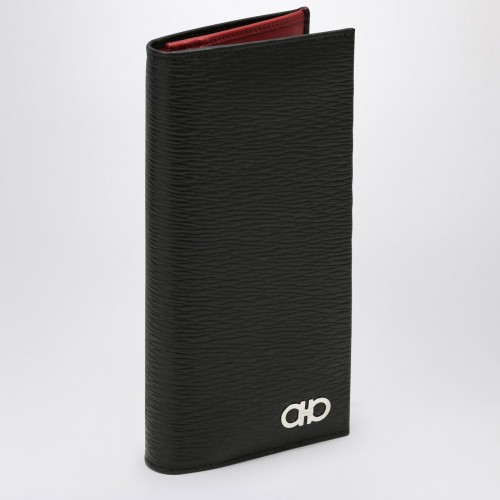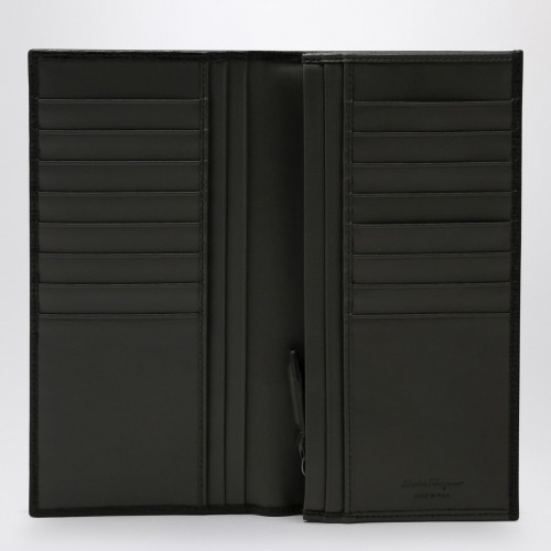 Continental wallet by Ferragamo in black grained leather, featuring a silver-tone metal Gancini logo on the front, a credit card slot, a banknote compartment and zipped coin pockets.