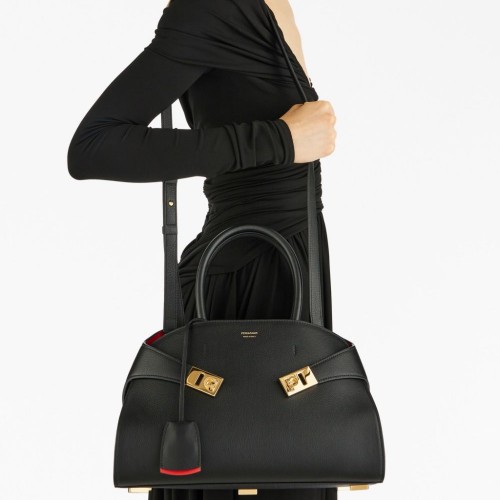 black calf leather Gancini plaque gold-tone logo lettering gold-tone hardware leather tag circular top handles adjustable detachable shoulder strap metal feet main compartment