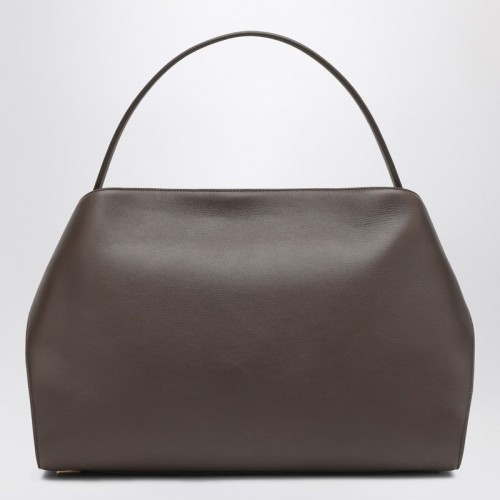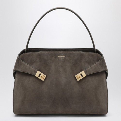 Clay coloured leather large shoulder bag from Ferragamo featuring a contrasting red interior, Gancini buckles in a gold-tone finish, an interior flap closure with a magnetic clasp, a central zipped compartment, a colour block effect design, an adjustable and removable shoulder strap, and an embossed lettering logo on the front.