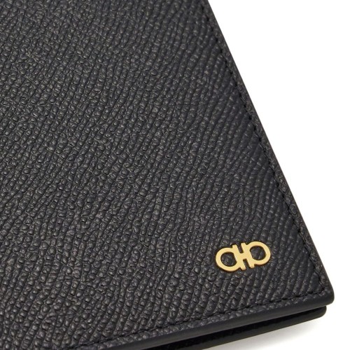 black leather grained texture Gancini plaque bi-fold design internal card slots