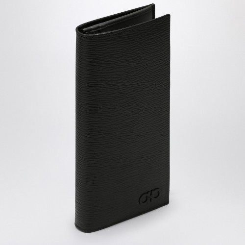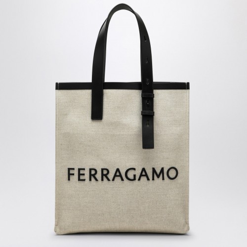 Tote bag by Ferragamo in black leather, featuring two handles, front flap with signature logo, key and badge holder charm, internal zip pocket and metal feet on the bottom.