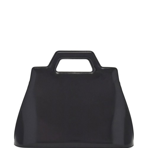 Intense black, veal leather, swivel closure gancini, handle with design cut out, unique compartment and gold -colored details.