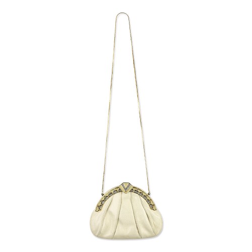 The Finesse La Model Cream Lizard Skin Medium Frame Clutch with Chain Strap captures vintage luxury with modern poise. Crafted from genuine lizard leather with a gold and crystal-accented top trim, this structured clutch features a lift claw latch closure and chain strap for timeless elegance.