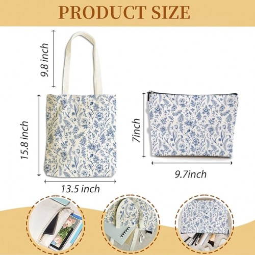 - Spacious and Practical: The large capacity canvas tote bag measures 15.8×13.5 inches and is equipped with a 9.8 inch handle, which can be easily hung on the shoulder or held in the hand. It has a large space to store all your necessities, including clothes, phones, pouch, laptops, tablets, cosmetics, glasses, etc. The cute cosmetic bag measures 9.8×7 inches, suitable for cosmetics, toiletries, eyebrow, eyeliners, face creams, lipsticks, sunglasses or small personal items.