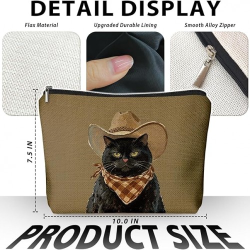 Funny Black Cat Makeup Bag, Cat Mom Lady Lovers Gifts for Women Cosmetic Bag, Pet Lover Gifts, Funny Western Cowboy Black Kitten Small Toiletry Bags Zipper Makeup Pouch
