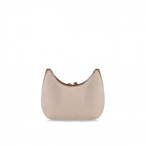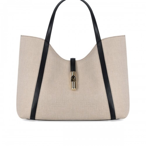 Shoulder bag Goccia S by Furla made of canvas fabric and smooth leather inserts, in shades of beige and brandy brown. Characterized by a double-slider zip closure, it is adorned with cylindrical hardware finished in gold metal, with the Arco logo on one of the two leather pullers. Equipped with an adjustable smooth leather handle, it has an open wall pocket and a pocket with zip closure inside. Dimensions 22x21x7.5 cm.