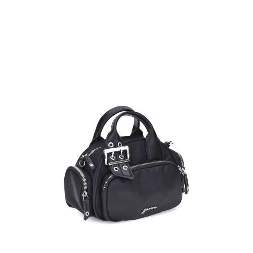 Ganni’s Polochon mini Handbag combines functionality with contemporary style. Featuring a top handle and an adjustable shoulder strap with metallic trim, it has a secure zipper closure, a front pocket and two side pockets for convenient organization. The silver-tone GANNI logo completes the design with a distinctive touch.