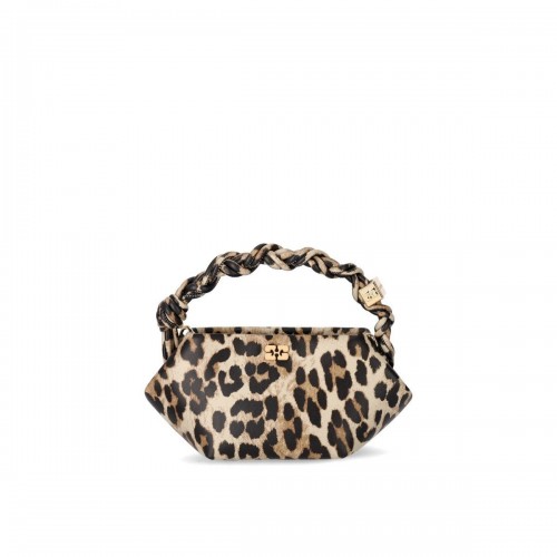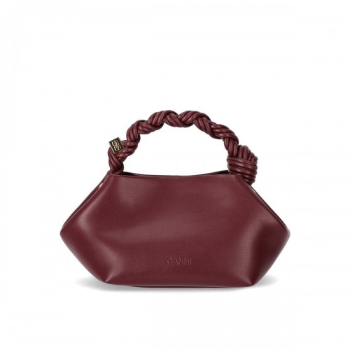 Bou handbag by Ganni made of recycled leather, in burgundy color. Characterized by an internal magnetic closure, it features a braided top handle, finished with metal studs bearing the Ganni logo and butterfly, engraved. On the front, it has a tone-on-tone Ganni butterfly logo, and on the back of the bag, embossed. Lined inside, it has two compartments, with a flat internal pocket. Adjustable and removable shoulder strap. Dimensions, 28x17x14 cm.
