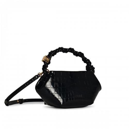 Made of recycled leather, polyester and polyurethane blend, braided top handle with logo medallion, single compartment with snap button closure, adjustable and removable shoulder strapn24 x 13 x 10 cm