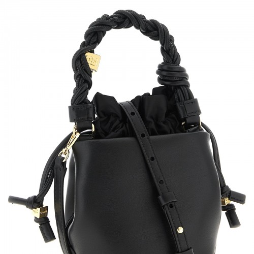 ‘Mini Bou Bucket’ leather handbag with woven fixed handle, drawstring lining, back embossed logo, metal dice details with engraved logo, adjustable and removable shoulder strap.