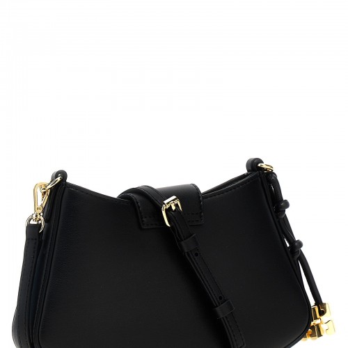 ‘Mini Swing’ leather crossbody bag, magnetic closure, front embossed logo, short chain handle, long removable leather shoulder strap, pendant logo charm.