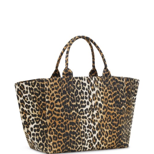 Brown/white recycled cotton canvas leopard print embroidered logo to the front embroidered slogan two top handles open top main compartment
