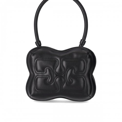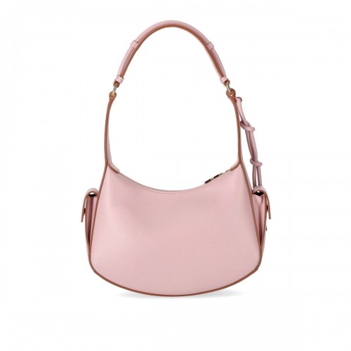 Ganni bag made of recycled pink leather, embellished with a golden metal logo detail. It has a lined interior, side pockets with snap button, and zip closure. Measures 23x17x7.8 cm.