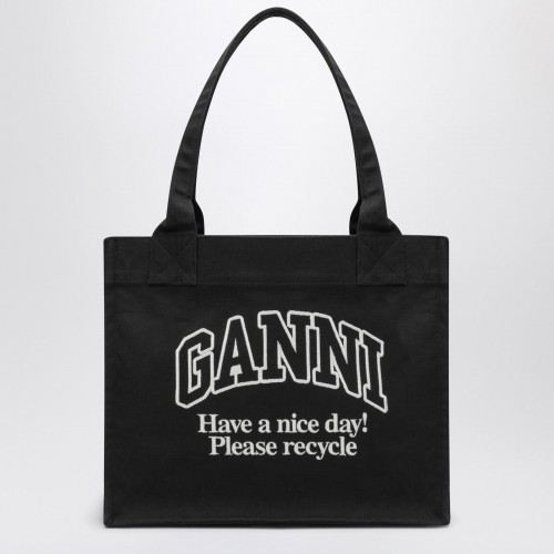 Ganni black canvas tote bag, featuring two handles, an internal zip pocket, and a contrasting logo on the front.