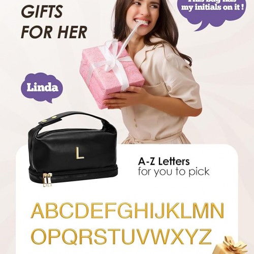 Gift for Her, Personalized Makeup Bags with Handle, Waterproof Double Layer Cosmetic Bag, PU Leather Makeup Bags Letter Travel Toiletry Bag with Makeup Brush Organizer