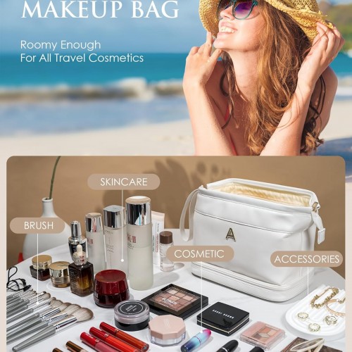 Gifts for Girls, Initial Large Makeup Bag, Personalized Double Layer Cosmetic Bag with Makeup Brush Organizer, PU Leather Travel Toiletry Bag Gift For Daughter, Preppy Things For Girls