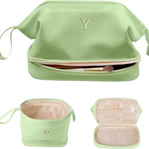 Gifts for Teacher-Initial Makeup Bags, Personalized Double Layer Cosmetic Bag with Makeup Brush Organizer, Women Birthday Gifts, Large Capacity PU Leather Toiletry Bag, Gifts for Friends
