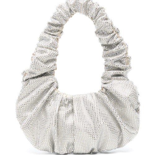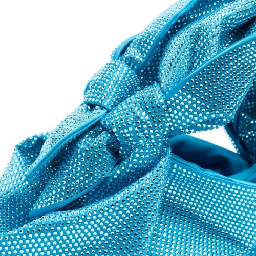azure rhinestone embellishment knot detailing concealed magnetic fastening two top handles satin lining internal logo patch internal patch pocket main compartment