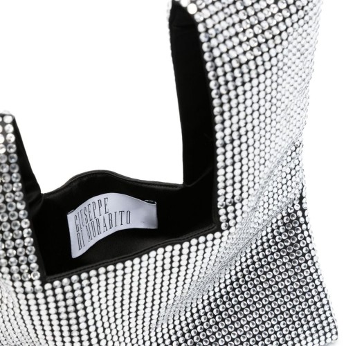 black/silver-tone twill weave glass crystal embellishment internal logo tag two asymmetric top handles sliding-handle closure main compartment full lining