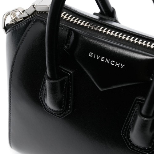 Antigona logo-lettering tote bag from Givenchy featuring black, calf leather, silver-tone hardware, silver-tone logo lettering, two top handles, adjustable detachable shoulder strap, top zip fastening and main compartment.