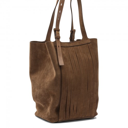 Golden Goose “24.7” suede shoulder bag with soft construction and flexible structure. It features an elongated silhouette, double adjustable handles for shoulder carrying, and bangs applied along the sides. Removable interior clutch adds a separable functional element. The design favors natural materials, with attention to details of leather workmanship.