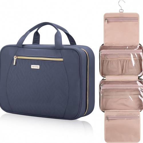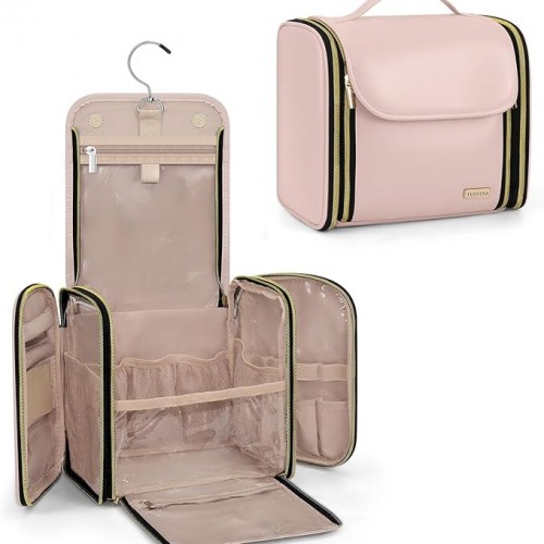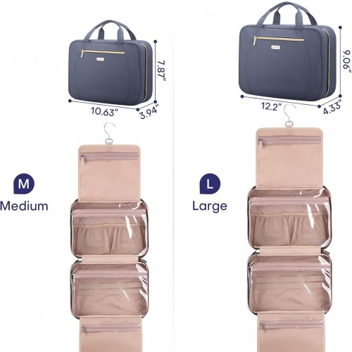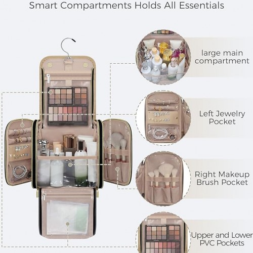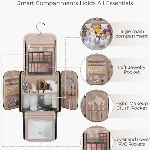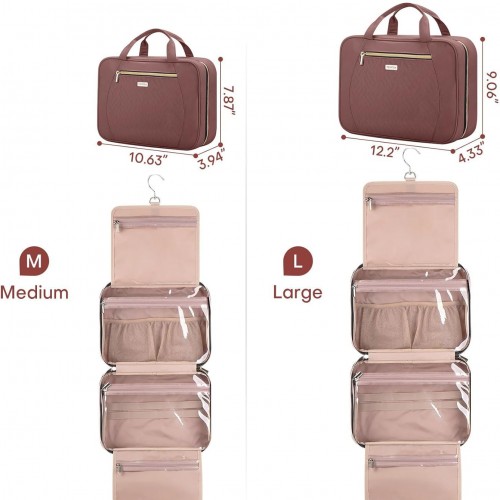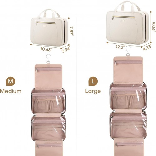 Hanging Toiletry Bag for Women Travel, 2 Sizes Large & Small Waterproof Cosmetic Organizer with 4 Compartments, Rotating Hook, Foldable Pink Travel Bag for Toiletries & Makeup – Medium Beige