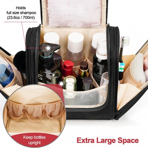 Hanging Travel Toiletry Bag for Women and Men, 6 Organizer Compartments, Large Toiletries essentials, Bathroom Cosmetic Accessories, Water-resistant Makeup Bag, Holds Full-Size Shampoo, Black