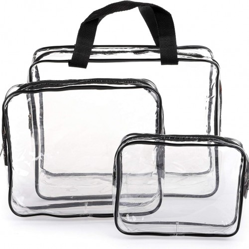 - 9 Pack 3 Different Sizes – 3 x large clear makeup bag, 11.8″ x 4″ x 8.6″; 3 x medium clear toiletry bag, 9.4″ x 2″ x 7.8″; 3 x small clear cosmetic bag, 7″ x 1.5″ x 5.5″.